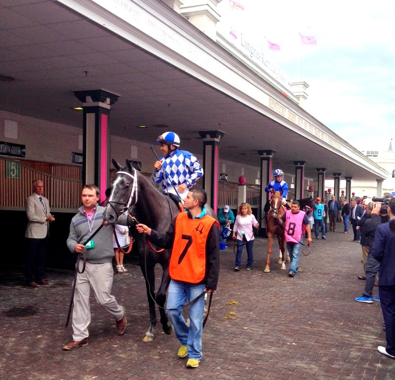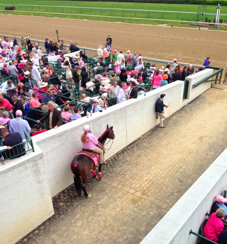 I love the "pink" dressed horse and rider awaiting the arrival of the thoroughbreds.